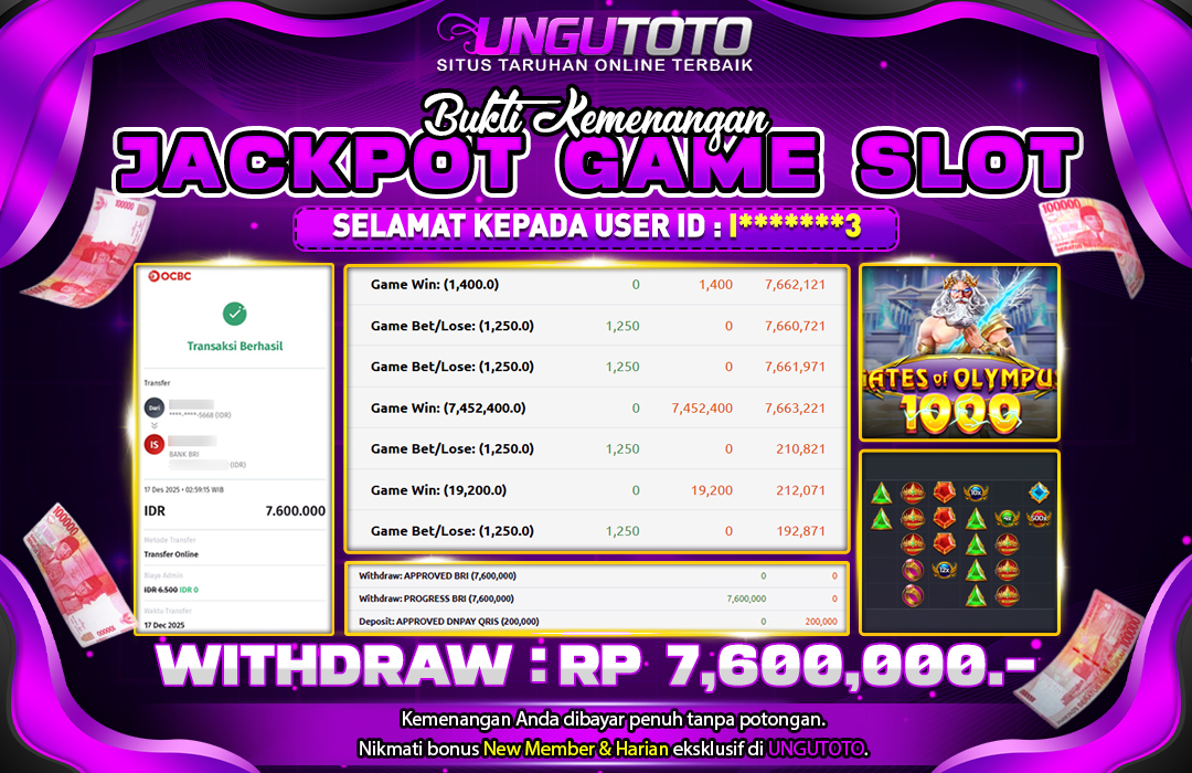 Selamat Kepada Member UNGUTOTO I******3 Telah Jackpot Di GATES OF OLYMPUS 1000